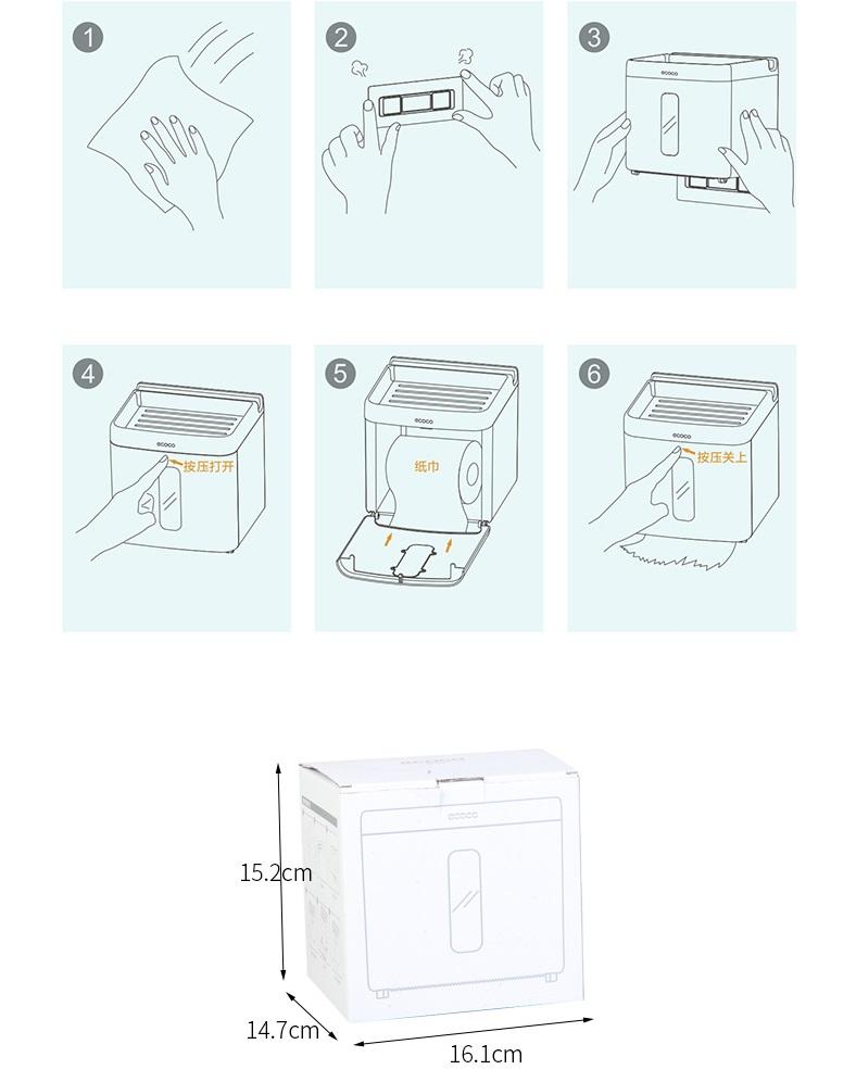 این باکس بدون نیاز به هیچ گونه میخ و دریل تنها با نگهدارنده ی مخصوص چسبی خود نصب می شود.ابتدا سطح مورد نظر برای نصب را با دستمال پاک کنید سپس برچسب نگهدارنده را کنده آن را در مکان مناسب بچسبانید.سپس باکس را بصورت کشویی وارد نگهدارنده کنید.روی این باکس محفظه ای شیشه ای برای دیدن درون باکس نیز وجد دارد که شما را از مقدار باقی مانده ی رول و محتویات باکس آگاه می کند.